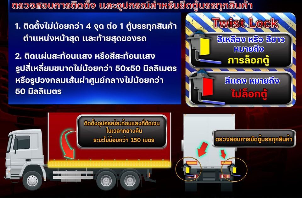 การติดตั้งอุปกรณ์สำหรับยึดตู้บรรทุกสินค้า (Twist-Lock) ต้องติดตั้งน้อยกว่า 4 จุด ต่อ 1 ตู้บรรทุกสินค้า และต้องอยู่ในตำแหน่งที่ทำให้การกระจายน้ำหนักบรรทุกมีความ เหมาะสม นอกจากนี้ต้องติดแผ่นสะท้อนแสงสีเหลือง/ขาว และสีแดงที่ตัวอุปกรณ์ เมื่ออุปกรณ์สำหรับยึดตู้บรรทุกสินค้า (Twist-Lock) อยู่ในตำแหน่งการล็อกต้องปรากฏสัญลักษณ์สีเหลืองหรือสีขาวตามแนวยาวของตัวรถ หากอุปกรณ์สำหรับยึดตู้บรรทุกสินค้า (Twist-Lock) อยู่ในตำแหน่งไม่ล็อก จะปรากฏสัญลักษณ์สีแดงตามแนวยาวของตัวรถอย่างชัดเจน เพื่อเป็นจุดสังเกตให้ผู้ใช้รถใช้ถนนร่วม ทางมองเห็นได้อย่างชัดเจน นอกจากนี้ต้องติดตั้งอุปกรณ์ สะท้อนแสงที่สามารถสังเกตเห็นได้อย่างชัดเจนในเวลา กลางคืนในระยะไม่น้อยกว่า 150 เมตร และหากเป็นรถบรรทุกลักษณะที่มีจำนวนเพลาล้อ กงล้อและยาง ตั้งแต่ 2 เพลา 4 ล้อ ยาง 6 เส้น ขึ้นไป (ยกเว้นรถลากจูง) ต้องติดตั้งแผ่นสะท้อนแสงควบคู่กับอุปกรณ์สะท้อนแสงด้วย โดย แผ่นสะท้อนแสงต้องมีความกว้างอย่างน้อย 0.50 – 0.60 เซนติเมตร ติดตั้งสูงจากพื้นอย่างน้อย 25 – 150 เซนติเมตร ด้านท้ายรถต้องติดตั้งเป็นแนวยาวรอบขอบทุกด้านโดยใช้ แผ่นสะท้อนแสงสีแดงหรือสีเหลือง ส่วนด้านข้างติดตั้งแผ่น สะท้อนแสงสีขาวหรือสีเหลืองเป็นแนวยาวเฉพาะขอบด้านล่าง และติดตั้งเพิ่มเติมเฉพาะที่มุมด้านบนเพื่อแสดงระยะความสูงของรถ หรืออาจติดตั้งเป็นแนวยาวรอบขอบทุกด้านได้เช่นเดียวกัน รถที่ติดตั้งแผ่นสะท้อนแสงต้องเป็นไป ตามข้อกำหนดของกรมการขนส่งทางบก