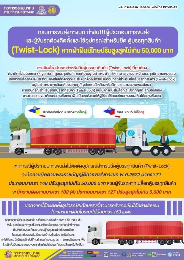 ผู้ประกอบการขนส่ง ต้องติดตั้งและหมั่นตรวจสอบอุปกรณ์สำหรับยึดตู้บรรทุกสินค้า (Twist-Lock) ดูแลความปลอดภัยให้อยู่ในสภาพพร้อมใช้งาน ถ้าเพิกเฉยจะถูกลงโทษตามกฎหมายสูงสุดทันที หากไม่ติดตั้งอุปกรณ์สำหรับยึดตู้บรรทุกสินค้า (Twist-Lock) จะมีความผิด ตามพระราชบัญญัติการขนส่งทางบก พ.ศ.2522 มาตรา 71 ประกอบมาตรา 148 ปรับสูงสุดไม่เกิน 50,000 บาท ส่วนผู้ขับรถหากไม่ล็อกตู้บรรทุกสินค้าจะมีความผิดตามมาตรา 102 (4) ประกอบมาตรา 127 ปรับสูงสุดไม่เกิน 5,000 บาท