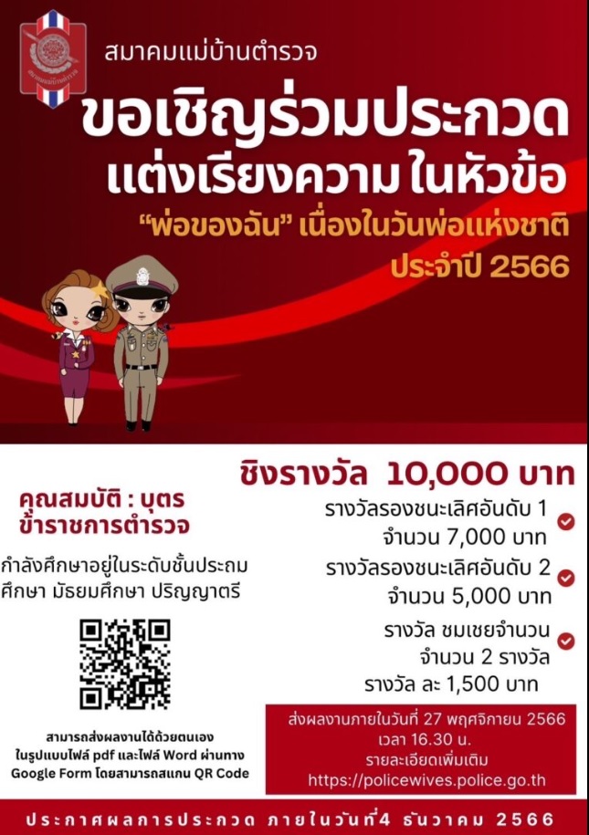สมาคมแม่บ้านตำรวจ เชิญชวนบุตรข้าราชการตำรวจฯ ร่วมส่งเรียงความเข้าประกวด ในหัวข้อ “พ่อของฉัน