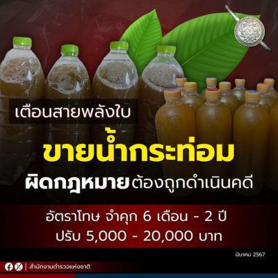 เตือนสายพลังใบขาย “น้ำกระท่อม” ผิดกฎหมายต้องถูกดำเนินคดีมีอัตราโทษจำคุก 6 เดือน – 2 ปีปรับ 5,0