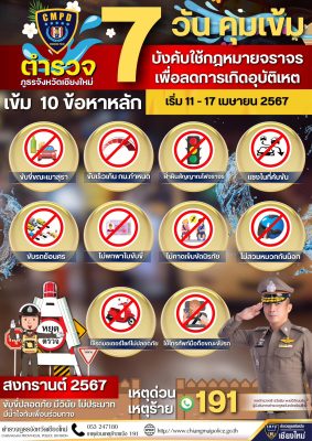 ตำรวจภูธรจังหวัดเชียงใหม่ ห่วงใยทุกชีวิตบนถนน บังคับใช้กฎหมายจราจร 10 ข้อหาหลัก เพื่อลดการเกิดอุบัติ