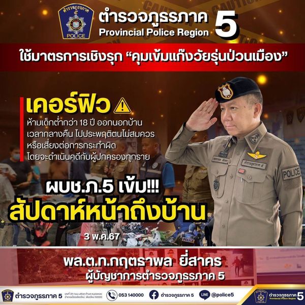 3 พฤษภาคม 2567 พล.ต.ท.กฤตธาพล ยี่สาคร ผบช.ภ.5 ออกมาตรการเชิงรุก “คุมเข้มแก๊งวัยรุ่นป่วนเมือง&#