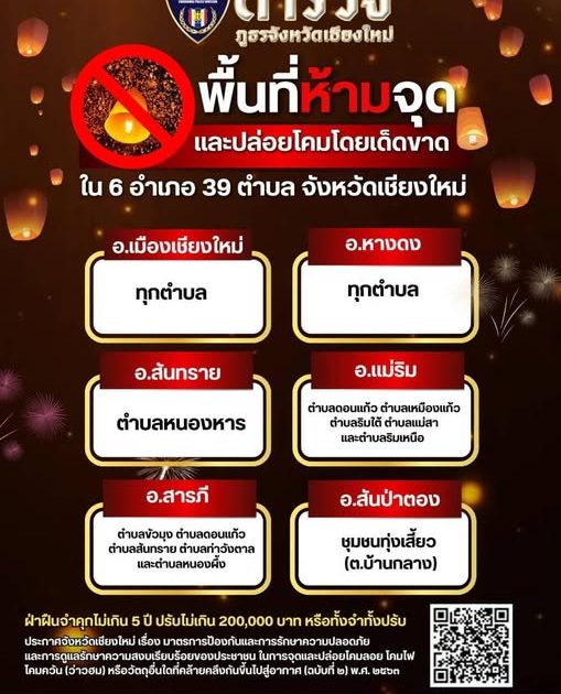 ขอแจ้งประชาสัมพันธ์ห้ามจุดและปล่อยโคมเด็ดขาด ในพื้นที่ 6 อำเภอ 39 ตำบล