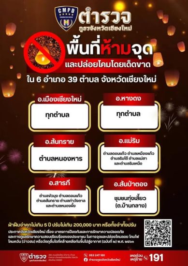 ขอแจ้งประชาสัมพันธ์ห้ามจุดและปล่อยโคมเด็ดขาด ในพื้นที่ 6 อำเภอ 39 ตำบล – ผู้ใดฝ่าฝืนดำเนินตามก