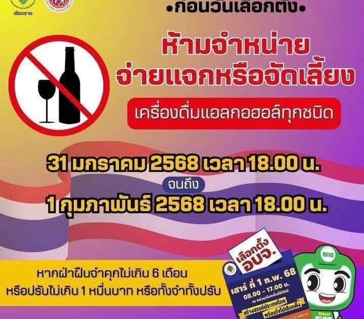 ห้ามจำหน่าย จ่ายแจกหรือจัดเลี้ยง เครื่องดื่มแอลกอฮอล์ทุกชนิดตั้งแต่วันที่ 31 มกราคม 68 เวลา 18.00 น. ถึง วันที่ 1 กุมภาพันธ์ 68 เวลา 18.00 น.