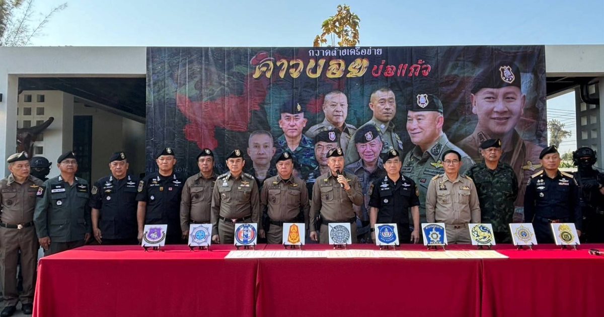 วันนี้ (12 กุมภาพันธ์ 2568) พล.ต.อ.ประจวบ วงศ์สุข รองผู้บัญชาการตำรวจแห่งชาติ พร้อมด้วย พล.ต.ท.สันติ ชัยนิรามัย ผู้บัญชาการตำรวจปราบปรามยาเสพติด พล.ท.กาจน์ กอรี รอง ผบ.นบ.ยส.35 พล.ต.ต.ธวัชชัย พงษ์วิวัฒนชัย รองผู้บัญชาการตำรวจภูธรภาค 5 นายธันวา ผุดผ่อง ผู้อำนวยการสำนักงานป้องกันและปรายปรามยาเสพติด ภาค 5 นายกิติพัฒน์ กะวัง นายอำเภอสันทราย และผู้แทนหน่วยงานที่ข้อง ร่วมแถลงผลการปฏิบัติการปิดล้อมตรวจค้น “กวาดล้างเครือข่ายคาวบอยบ่อแก้ว” เพื่อจับกุมบุคคลในเครือข่ายตามหมายจับ และยึดอายัดทรัพย์สินผู้เกี่ยวข้อง