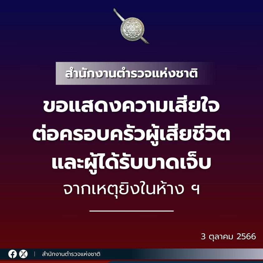 สำนักงานตำรวจแห่งชาติต้องขอแสดงความเสียใจต่อครอบครัวผู้สูญเสีย รวมถึงผู้บาดเจ็บ พล.ต.ท.อาชยน ไกรทอง