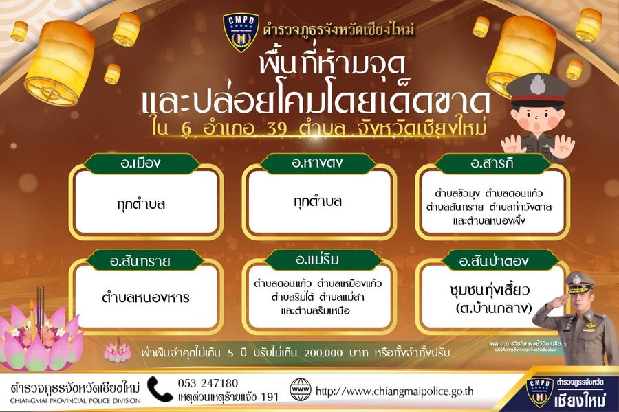 เชียงใหม่ ย้ำ!! ช่วงยี่เป็ง ปล่อยโคมลอยได้เฉพาะพื้นที่ได้รับอนุญาตเท่านั้น และต้องเป็นโคมที่ได้มาตรฐ