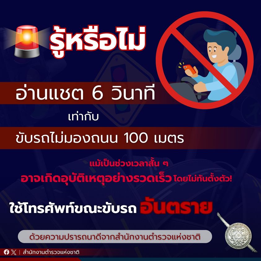 ขับไม่แชต รู้หรือไม่ ทุกครั้งที่ท่านใช้โทรศัพท์มือถือระหว่างขับรถ มีความเสี่ยงเกิดอุบัติเหตุ ทุกครั้